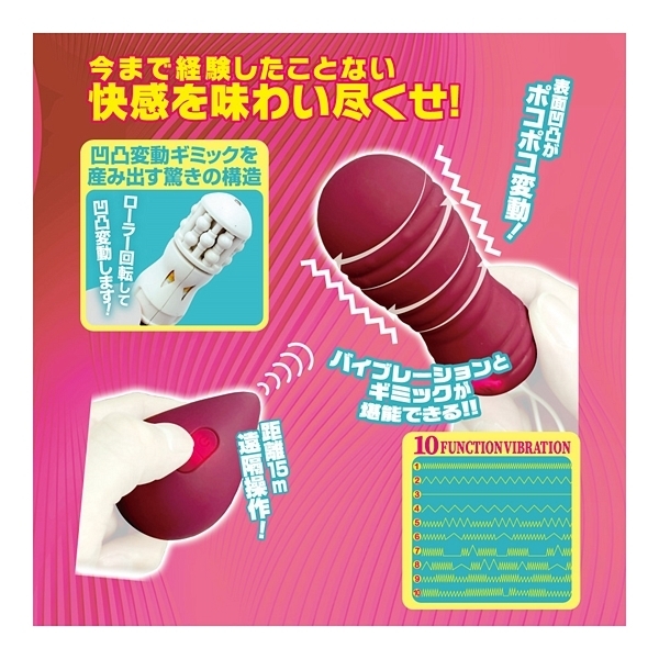 ただ震えるだけじゃない!特殊な機巧アクションが遠隔操作で楽しめる、新しいワイヤレスローター「リモコンギミック」!ワインレッドカラーの「ローラー」は、表面の凹凸が変動するローラーギミックを搭載!小さなボディながらも、内蔵ローラーが回転するアクションで、表面凹凸がポコポコと変動します。電動バイブのパール刺激がもつあの気持ちよさ、モバイルで楽しめます!さらに、ギミック部分だけではなく、リモコン部分も最先端!遠隔操作の距離は15mまでOK。操作もシンプルな2ボタン式。動作ファンクションは10アクションパターン。本体部分には触り心地の良いシリコン素材。本体はUSB充電&リモコンは単四電池と、入手しやすさも抜群。さらには、本体だけでも動作できるスグレモノ!まさに新時代リモコンローターのフラグシップマシン!新感覚のリモコンプレイを堪能しましょう!