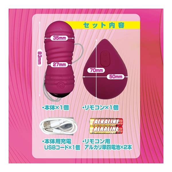 パッケージ:17.8×10.7×4.0cm 本体:8.3×3.5cm 重量:68g 電池:ローター(USB充電式)、リモコン(単四電池×2本使用)