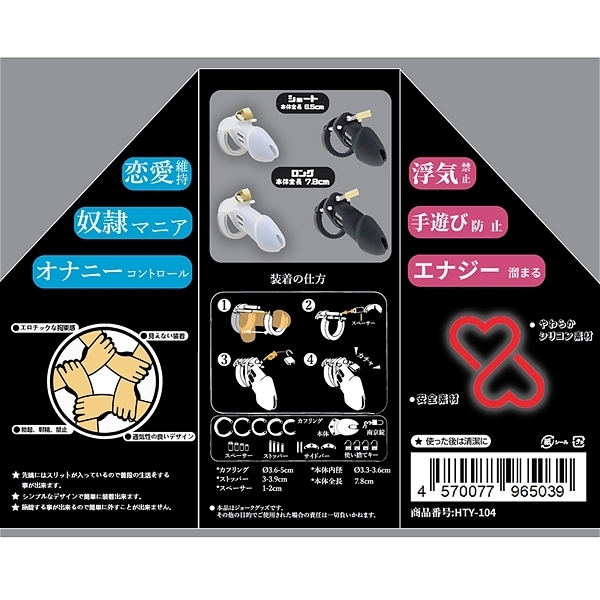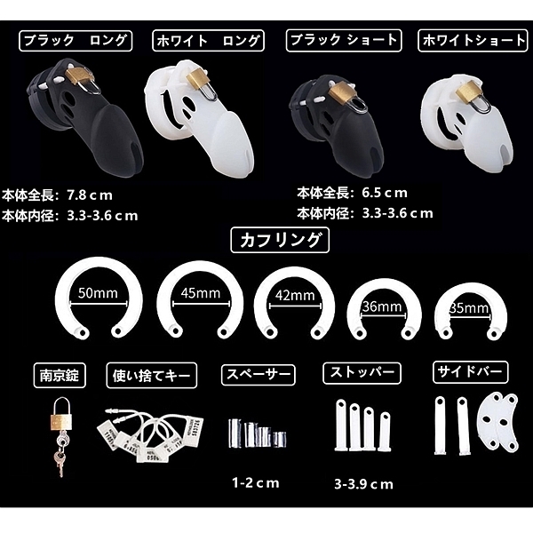 各部品を組み立てることで、あらゆるサイズに適した貞操帯が出来ます。先端に排泄口があるので装着中も排尿が出来ます。南京錠をすることで射●管理を確実に行うことが出来ます。ロング・ブラック