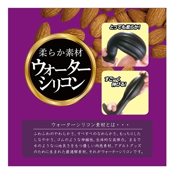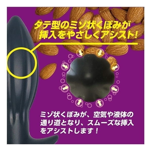 アーモンドフォルム×ウォーターシリコン!形状と素材にこだわった、新感覚ア●ルプラグが新登場!アーモンドナッツのような形状は、先端部に向かってすぼんでいく流線フォルムとなり、スルッとした挿入感を生み出します。さらに、中央部に配置された縦縞状のくぼみが、空気や液体の通り道となり、挿入心地をサポート。最下部は返しの付いた錨モデルで、ヒップラインに沿ったデザインが違和感を低減させます。本体素材には、最先端のウォーターシリコン素材を使用しました。水のように柔らかい、と大評判の人気素材です。すべすべな滑らかさ、もっちりとした肉感弾力、ゴムのように伸びる高伸縮性。あなたにピッタリ寄り添う恍惚素材とスムーズなインサートとなる快感型状で、新しいア●ルプラグです。「XL」は太さ68ミリのマキシマムモデル。