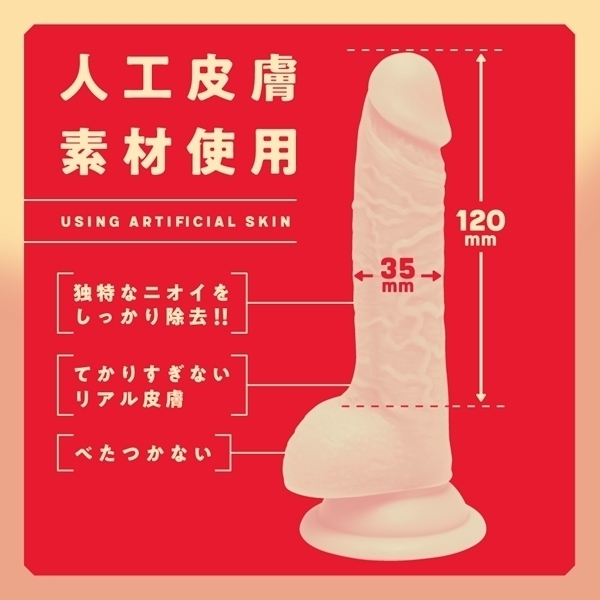 よりリアルを追求した、国内生産×国産人工皮膚素材のディルドができました。人工皮膚素材によって、てかりすぎないリアルな皮膚を再現しながら誰にでも安心して使えるようにひとつひとつ丁寧に作っています。ぷにっとやわらかやみつき感触×人工皮膚素材とリアルな造形でこだわりの仕上がり。棒部分の長さは120mm。先端部分の最大径は35mm。