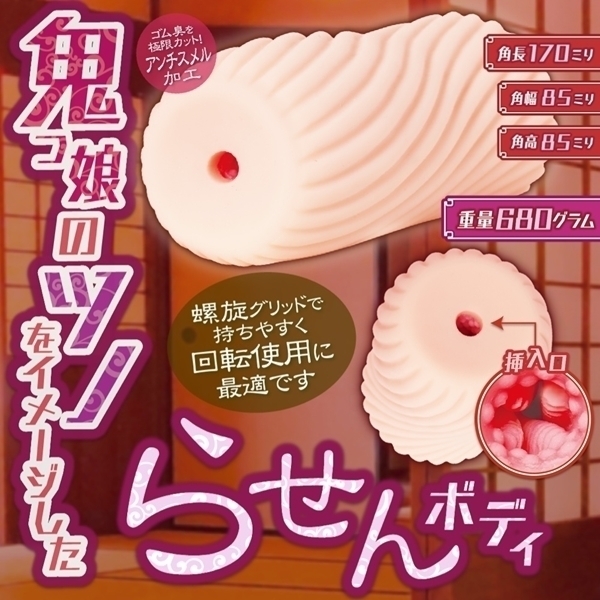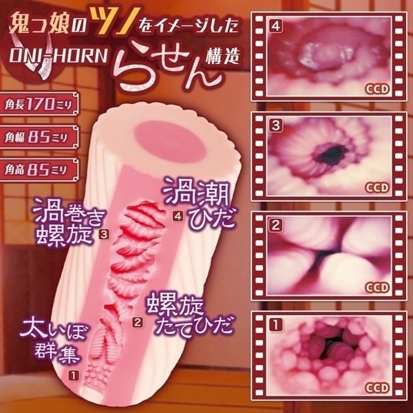 「今宵は逃がさぬぞ!朝までみとのまぐわいじゃ!!」オニノコ・フロウは鬼っ娘の「ツノ」をイメージした”らせん”特化のオナホールです。中は螺旋!外もラセン!と「らせん尽くし」の仕様で、らせん好きな方にご満足いただける性能となっています。重量680グラムのボディは、全身に”ラセン模様”が施された「ツノ」形状。ラセングリッドで持ちやすく、回転プレイに最適なフォルムです。ゴム臭を極限カットした「アンチスメル加工」の効力で激しいグリップでも安心して”鬼らせんプレイ”をお楽しみいただけます。内部はピンクの「桃艶二層素材」を採用。ハード仕様のギミックをやわらか素材で生成することで”絶妙の使用感”を実現させました。螺旋たてひだ・渦巻き螺旋・渦潮ひだなどの「螺旋フルコース」を是非ご賞味ください。保管に便利な専用ブリスターケース、オリジナルローション付属。