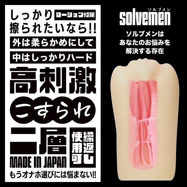 ソルブメンはあなたのお悩みを解決する存在です。皆様はこのような話をご存知でしょうか?「オナホは同じ構造でも素材が変わると使用感が違う」はい大正解です。それは真理です。でも世の中は同じ構造かつ別素材のオナホを必ずしも発売してくれません。それでは素材の違いによる使用感の変化を楽しむ事ができません。そんな時こそsolvemenにお任せください!全く同じ構造ながら二層構造の内部素材を変えたものがコチラ。「高刺激こすられ二層」と「低刺激ねっとり二層」になります。見た目は同じなのにアラ不思議。高刺激と低刺激を楽しめます。まるで魔法のようにあなたの快感を惑わせる事でしょう。素材だけではございません。「絶頂刺激連続ヒダ突起構造」と名付けた特殊な内部構造をご覧ください。どの素材でも一定の感度を担保する安定感の高い内部構造となっております。あなたはオナホ選びに悩む必要はなくなります。あなたのためにソルブメンがいるのです。安心安全の日本製で繰り返し何度でも利用が可能です。●高刺激