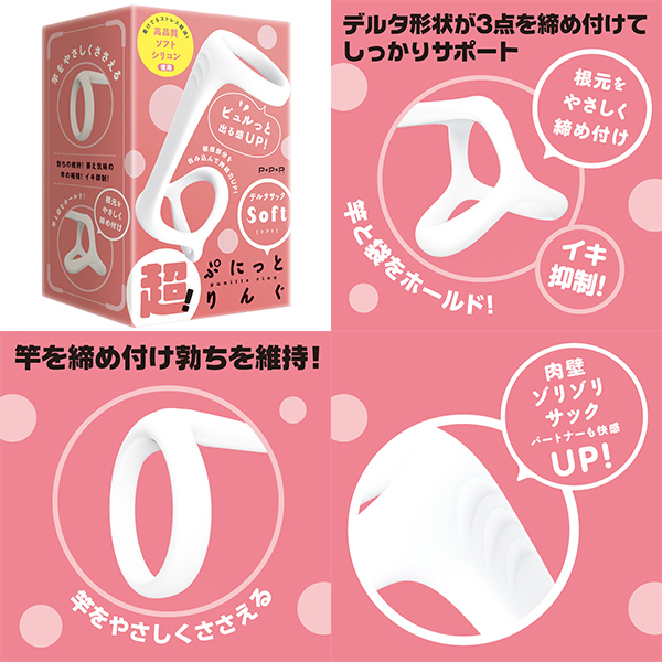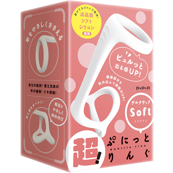 超!ぷにっとりんぐから、竿と根元をしっかりサポートするリングが登場。根元を3点で締め付けるデルタリング!竿をやさしくささえるリングでイキ抑制!サッと装着♪ピタッと密着!装着しやすい伸縮性、臭いのない高品質シリコンでやさしく締め付け、着けてるストレスを軽減!すべすべ装着感で毛の巻き込みを緩和。肉壁ゾリゾリサックでパートナーも快感UP! 自分好みの締め付けで勃ちの維持!萎え気味の竿の補強!イキ抑制!ソフトな締めつけでビュルっと出る感UP♪ゆ〜っくり夢心地発射!