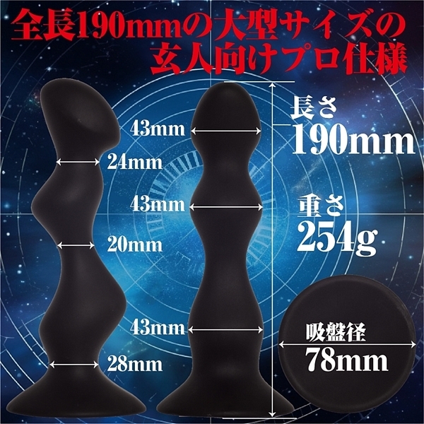 快感ボール内蔵の高品質シリコン製のアナルディルドの登場です。全長190mmの大型サイズで玄人向けのプロ仕様です。表面は高級シリコンのすべすべの肌触りで、内部には小刻みに動く「快感ボール」が3つ内蔵されており、運動時の小刻みな刺激で新感覚を味わえます。3段階のふくらみが圧迫感をしっかりと演出。圧倒的サイズ感で他の追随を許しません。アナル開発!前立腺開発!ドライオーガズム!パートナーと!外出のお供に!などいろいろな使い方が出来ます。特にお散歩は内部の快感ボールが振動し、新しい楽しみ方ができることでしょう。表面の高品質シリコンはすべすべの肌触りで気持ちよさを感じる質感になってます。強力吸盤の台座付きで床、壁などに貼り付けてハンズフリーで様々な楽しみを実現できます。