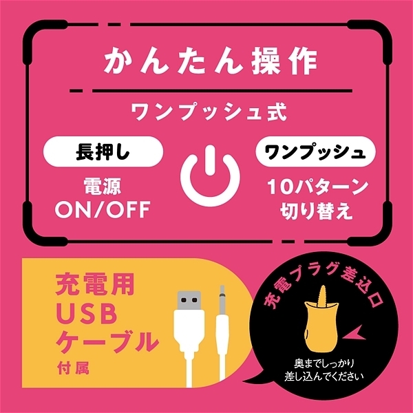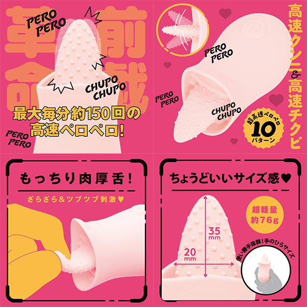 高速舌舐めローターでクンニイキ&チクビイキ!高品質ソフトシリコンを使用した肉厚舌は、もっちり弾力で、表面のツブツブがとても刺激的!ちょうどいいサイズ感の舌は、中も外もイケる万能舌です。マンネリしない多彩な高速ペロペロ10パターン!最大毎分約150回の高速ペロペロ!防水機能IPX6等級。静音設計 ≦60dB。●カラー:ピンク