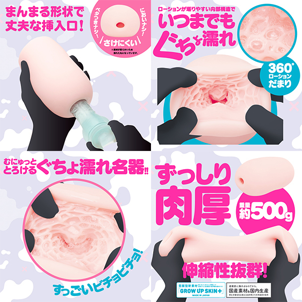 むにゅっととろけるぐちょ濡れ名器!すっごいビチョビチョの濡れやすい女の子ができました!360°ローションだまり!驚異のローション保有率でいつまでもグチョグチョ!激しめのウネウネロードはピストンするたびにぐりゅんぐりゅんとうごめくウェーブ快感!ヒダのシャクシャク感触もオススメでローションを閉じ込めるだけではない繊細な造形です!ずっしり肉厚な重量約500Gの中型ホールです。覚醒型素材【GROW UP SKIN+】は使うほどにあなたに馴染んで成長する人肌感覚の超やわらかい伸縮性の素材です。直接肌に触れるものだから安心の国産素材&国内生産 MADE IN JAPAN。パッケージイラスト:ミコジン