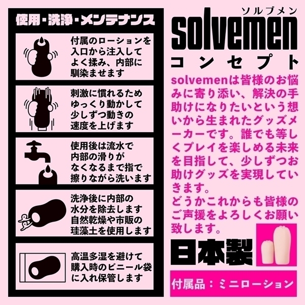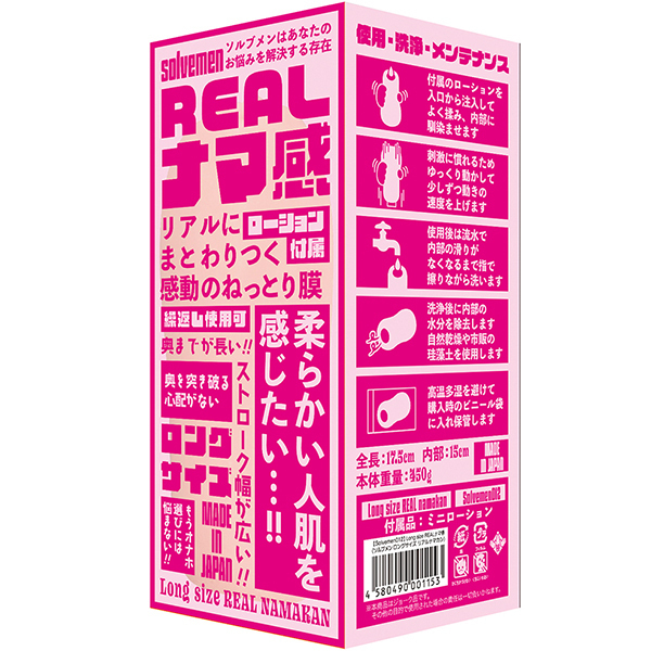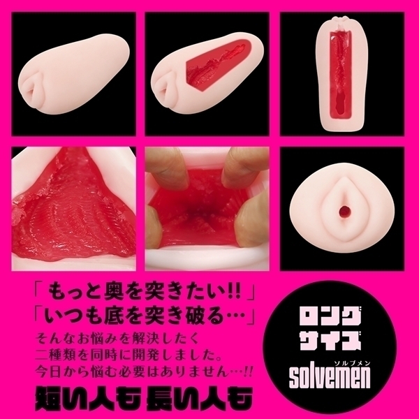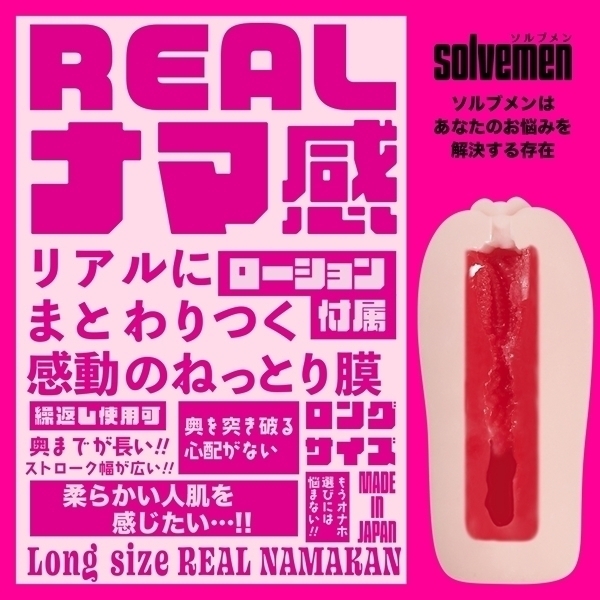 ソルブメンはあなたのお悩みを解決する存在です。「ロングサイズ REALナマ感」は大きくても全てを包み込むお悩み解決ホール。普通のホールでは物足りないアナタでも、ソルブメンのロングサイズなら全てを包み込まれる悦びを感じられる事でしょう。人肌素材のリアル二層弾力で快感のバランス抜群に良く包み込みます。この喜びを知ったらもう普通のホールには戻れません。あなたはオナホ選びに悩む必要はなくなります。あなたのためにソルブメンがいるのです。安心安全の日本製で繰り返し何度でも利用が可能です。