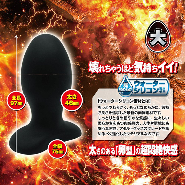 壊れちゃうほど気持ちイイ!太さのある卵型のアナルストッパー「アナル破壊」!サイズは小さめなのに、気持ち良さは破壊的!その秘密は、太さのある卵型の形状!圧迫感を強めるフォルムで、ストッパーの魅力である「詰まっている感」を最大限に刺激します。卵型が生み出す、超破壊的な尻穴悶絶快感をお楽しみください!さらに、使用素材にもこだわりました!破壊的な気持ち良さを加速させる、最新素材「ウォーターシリコン」を使用!もっとやさしく、もっとなめらかに。高級アダルトグッズに使われるシリコン素材をさらに進化させた、アダルトグッズをアップグレードする最新の肉感素材です。きめ細やかな質感、生々しい弾力、環境に優しい材料など、一歩進んだこの素材をぜひご堪能ください!「大」は、全長97ミリ×直径46ミリのやや小さめプラグ!他では味わえない破壊的な快感が楽しめます!