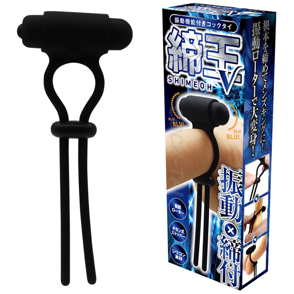 根本を締めてメンズキングに!快感キングクラスのコックタイ、「締王」!根本に巻きつけて、ネクタイのようキュッと締めれば、まるで王者のような貫禄に大変身!締め付け部分のコードストッパーは、自由に調整できるボタン式!本体素材は、肌触りがよいシリコン製!締め付ければ、もう貴男はまさにメンズキング!タイプ「V」は、「VIBRATION」の「V」!ブルブル震えるローターが組み込まれた、振動機能付きのコックタイです。自分もパートナーも振動快感を楽しめます!締め付け&振動ローターで、ダブル快感に大変身!