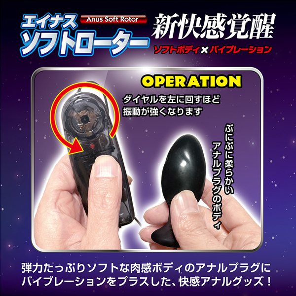 ぷにぷにと柔らかくて画期的!挿入しやすい全長81ミリの入門用にぴったりなアナルプラグ「エイナス ソフトローター (1)」。横幅は最大径31ミリで肉厚でボリュームたっぷり!弾力性抜群のアナルプラグにバイブレーション機能を搭載した新感覚のアナルグッズです。肉厚でエラストマー系の素材の感触は柔らかくて挿れ心地も抜群!コントローラーは有線でプラグと繋がっていて操作はダイヤル式。強弱も簡単に操作できて初心者でも扱いやすい!本体中央付近にモーターが内蔵されていて先端やネック部分はやわらかいです♪
