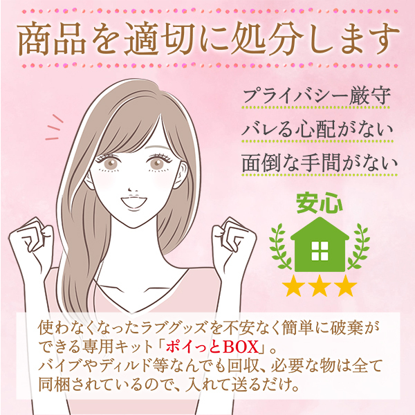 ラブグッズの処理に困った事はありませんか? その悩み、解決します!「アダルトグッズ、大人のおもちゃに興味はあるけど、捨て方がわからないし、一般のゴミと一緒に捨てた場合、万が一中身を見られたら…と考えると不安で買うのを諦めます」といった人もいるのでは?長年の販売実績と徹底したプライバシー管理。誰にもバレずに捨てたい人は当店にお任せ!ローター、バイブ、ディルドに電マ、勿論女性だけでなく男性の方もご利用頂けます。オナホ等、処理に困ったら是非ご利用下さい。※発送の手順を同梱しておりますので、必ず手順に従ってお送りください。※一回の購入に対して一度のみご利用可能です。また、同梱している伝票以外の荷物は受取り出来ませんのでご注意下さい。